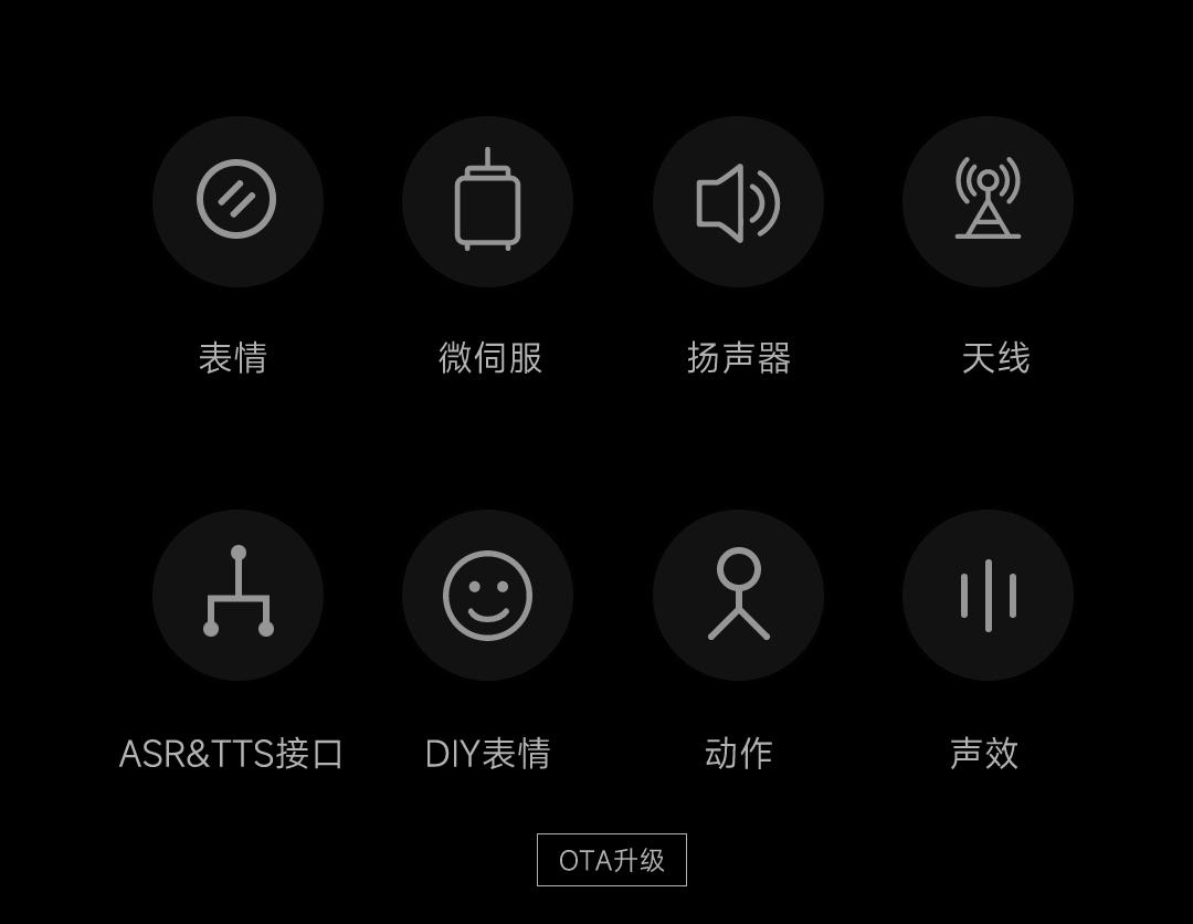 我们尽可能开放机器人的能力,开发者可使用微伺服、扬声器、天线、ASR&TTS接口,可DIY表情、动作、声效等。