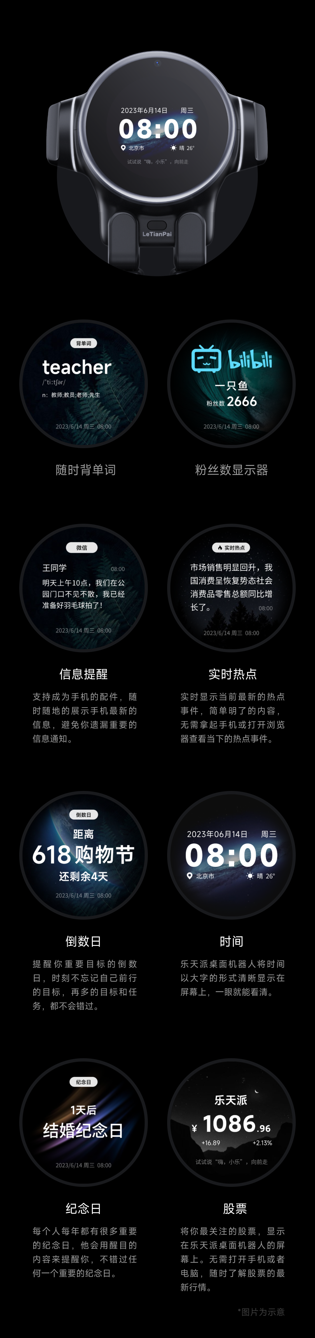 他可以化身记单词神器、粉丝数显示器、时钟、倒数日等丰富实用小工具,显示内容你来定。将重要信息清晰的内容显示在同尺寸机器人最大的2.1英寸大屏幕上。从此,你将很难遗漏任何你最关注的重要信息。