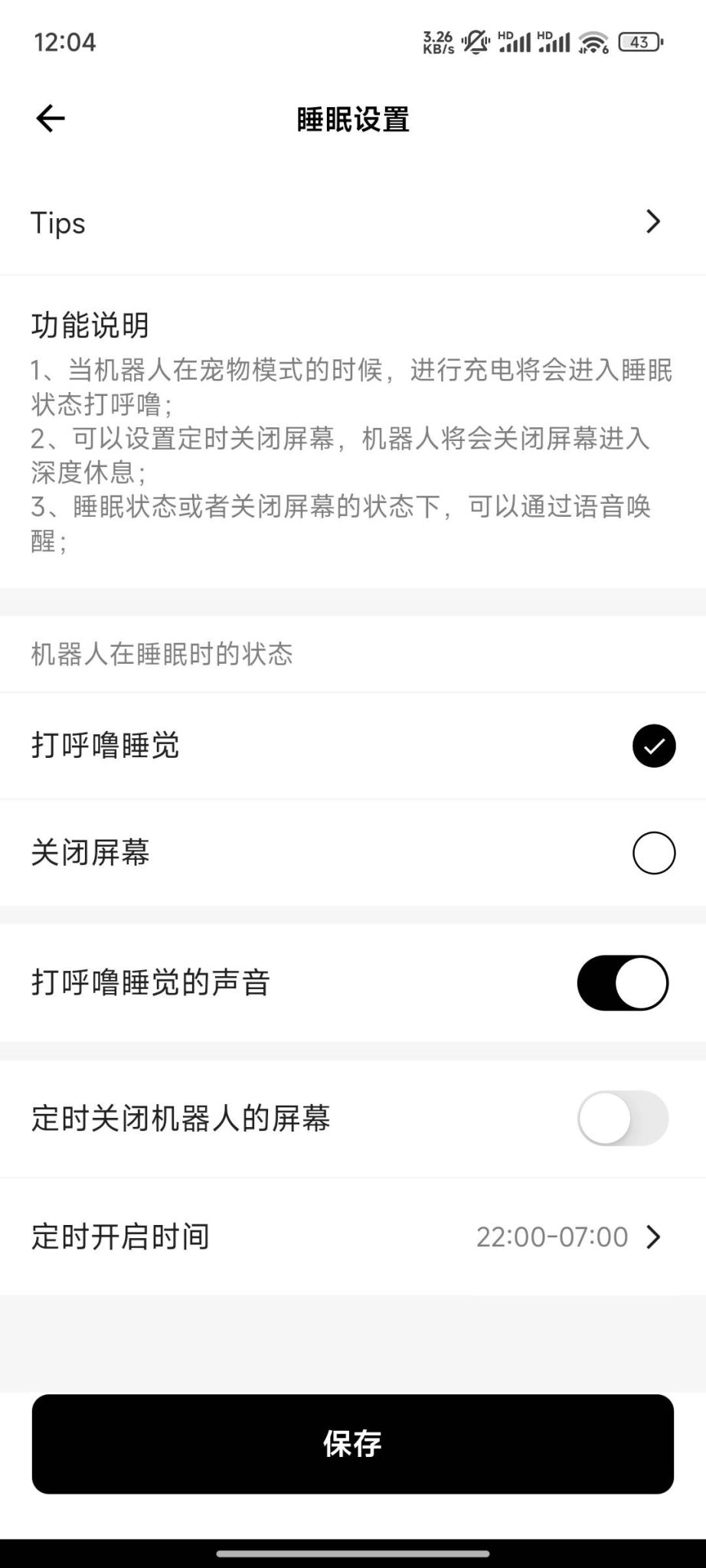 可以在【控制-睡眠设置】中,设置定时区间,让关闭机器人屏幕进入休息。